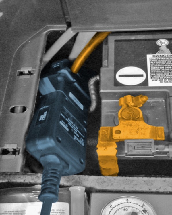 11 Подключить токоизмерительные клещи 100 A 9900/ET 310 (желтого цвета) к гибкой перемычке вблизи АКБ. Токоизмерительные клещи на автомобиле (на рисунке пример)