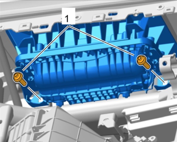1 Отвернуть два крепежных винта -1- модуля подушки безопасности переднего пассажира от монтажного кронштейна.