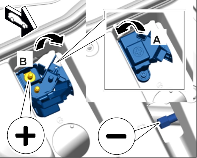 2. Откинуть защитную крышку на плюсовом полюсе приспособления для питания от внешнего источника -+- .