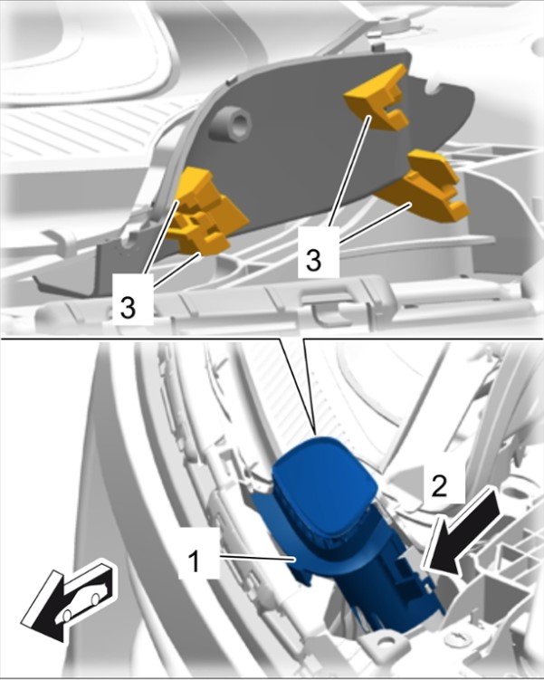 1.2 Отсоединить уплотнение с помощью пластикового клина в области форсунки омывателя фар на головной фаре и осторожно поднять.
