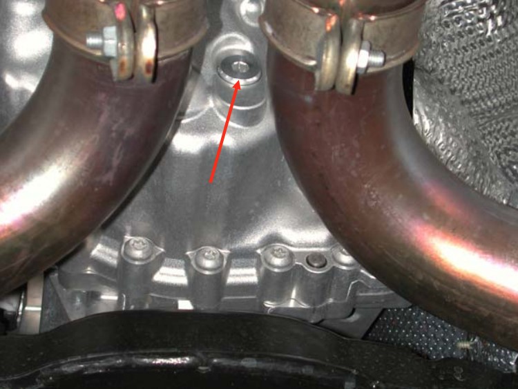 Если смотреть по направлению движения, то пробка отверстия для контроля масла находится сзади по центру, на конце коробки передач между выпускными трубами (стрелка).