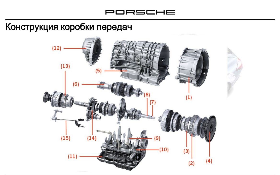 Каждая из двух частей коробки передач Porsche Doppelkupplung (PDK) состоит из одного многодискового сцепления и первичного вала. С точки зрения функциональности обе части коробки передач имеют конструкцию механической коробки передач и очень компактны в своем исполнении. Первичные валы частей коробки передач воздействуют на общий промежуточный вал, а оттуда посредством шестерни постоянного зацепления - на вторичный вал. Вторичный вал с помощью соответствующего фланца соединен с карданным валом, который приводит в действие колеса посредством главной передачи задней оси. В полноприводных моделях отбор мощности осуществляется посредством сцепления для полного привода по требованию, набора бевелоидных шестерен и соединительного вала прямо на главную передачу передней оси и, тем самым, на первичные валы колес. Управление сцеплениями и функциями переключения отдельных частей коробки передач осуществляется посредством гидравлического блока управления в нижней части коробки передач.
