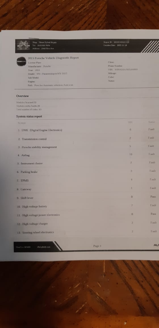 Здравствуйте ! Имеется Panamera 3.0 hybrid 2015 VIN WP0AD2A70FL040005. Машину притащили после каких то сервисов предистория была в дтп , кузов востановили а завести не смогли. Когда притащили проверил пирапатрон 12вольт там стоит перемычка , предохранитель на Высоковольтной батареии целый. Батарею зарядил. При запуске слышу тестовый запуск электромотора и после этогого срабатывает мотор на сцепление , двс не запускается и в режим READY не переходит.