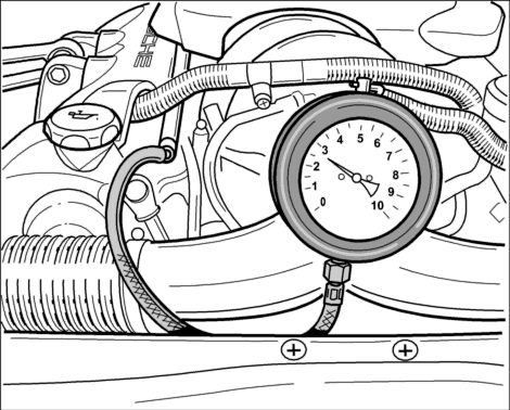 4. Включить зажигание и запустить двигатель. Посмотреть давление топлива на манометре. На ХХ значение должно составлять 4,0 ± 0,2 бар.