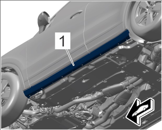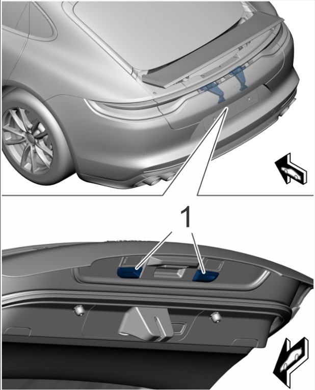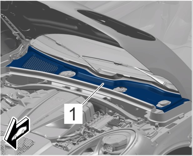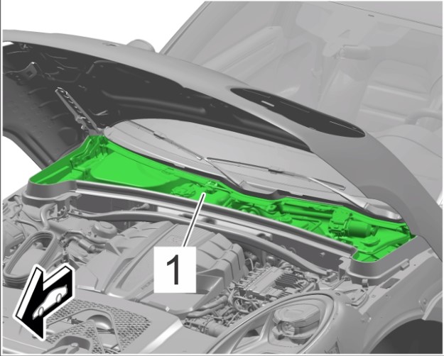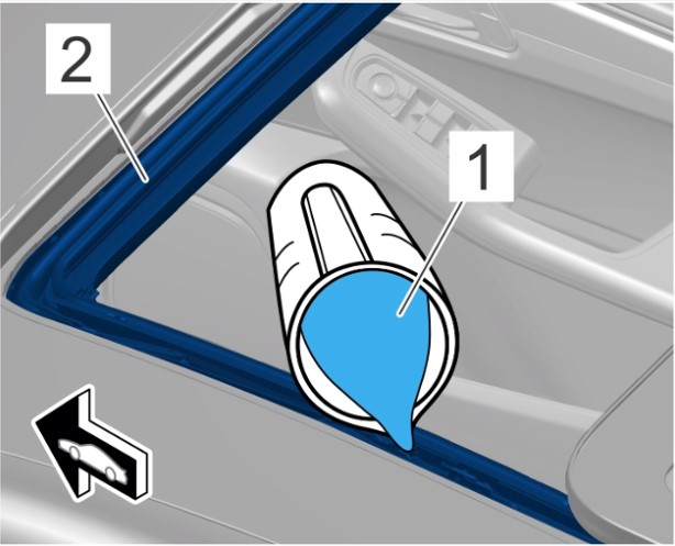 3 Осторожно налить 0,5 л воды -1- в направляющую сдвижного люка -2- и проследить за тем, чтобы вода протекала в соответствующий передний или задний водосток. Поэтапно повторить процесс, увеличив объем воды до 1 и 2 л.