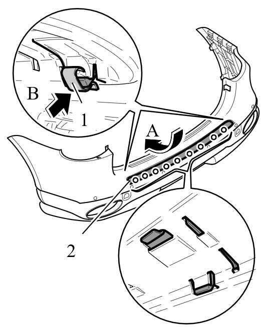 2. Крепежные скобы -1- вставить -стрелка B- .