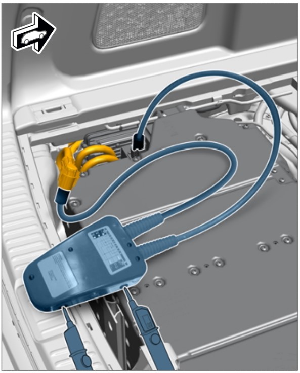 8 Измерьте напряжение на обоих высоковольтных контактах высоковольтной АКБ с помощью VAS 6558/9-7 - высоковольтных проверочных адаптеров HVR 40, актуального тестера и VAS 6558A - высоковольтного проверочного адаптера.