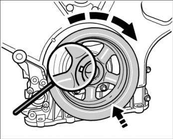 1. Насадить ременный диск втулку на торец коленвала. Затем слегка нажать на ременный шкив по направлению к двигателю, одновременно поворачивая его до тех пор, пока он не начнет скользить по направлению к крышке кожуха привода ГРМ. При этом следить за призматической шпонкой.