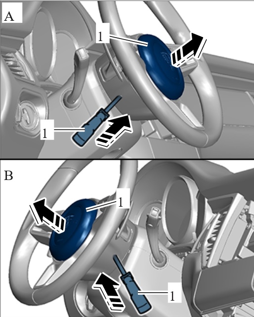 1.1. Вставить разблокирующий инструмент -1- параллельно рулевому колесу до соприкосновения с пружиной.