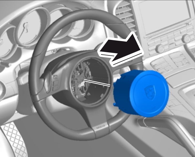 → Модули подушек безопасности всегда располагать выходным отверстием вверх, например, эмблема подушки безопасности водителя