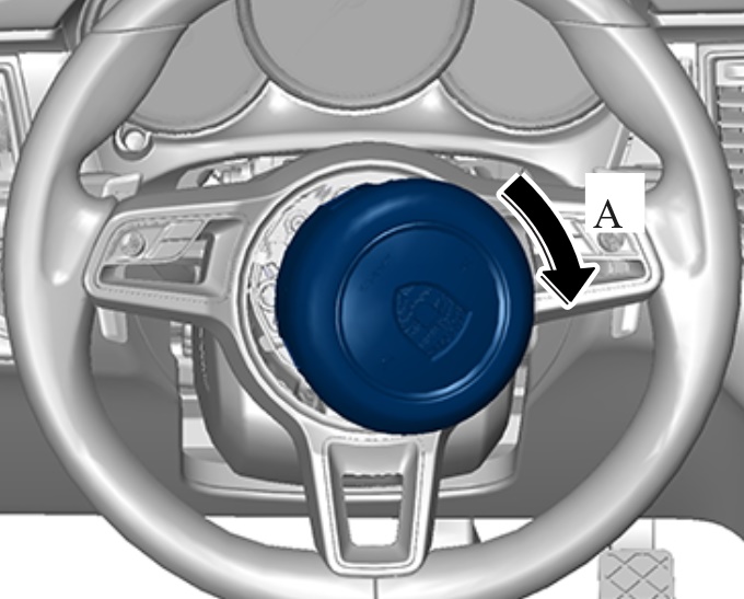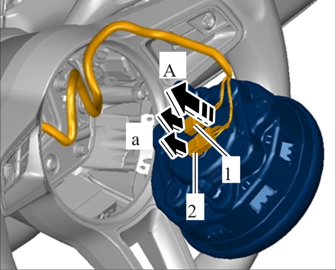 1. Повернуть модуль подушки безопасности прибл. на 120–180° по часовой стрелке так, чтобы жгут проводов рулевого колеса слегка зафиксировался в подушке безопасности -A- .
