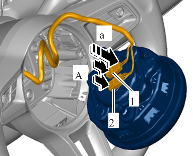 3. Разблокировать электрические штекерные соединения -1, 2- в направлении, указанном стрелкой, -a- и отсоединить их -A- .