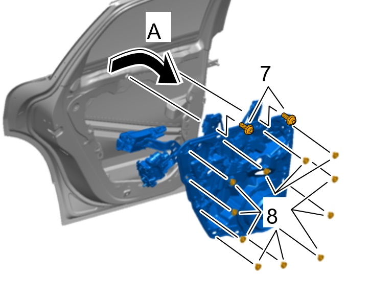 1.5. Ввернуть крепежные винты на стеклоподъемнике -7- и затянуть их с моментом затяжки → Момент затяжки: 8 Nm.