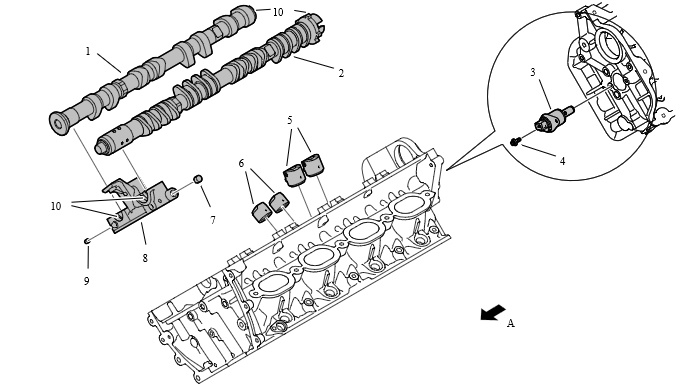 Крышки подшипников помечены E для впускного распределительного вала и A для выпускного распределительного вала. Крышки подшипников имеют сплошную нумерацию по цилиндрам.