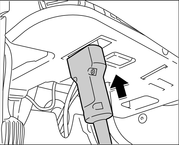 Подсоединить тестер Porsche к автомобилю через 16-контактный диагностический разъем. Диагностический разъем находится в салоне в пространстве для ног водителя (а/м с левосторонним расположением руля) или переднего пассажира (а/м с правосторонним расположением руля) -стрелка- под передней панелью.