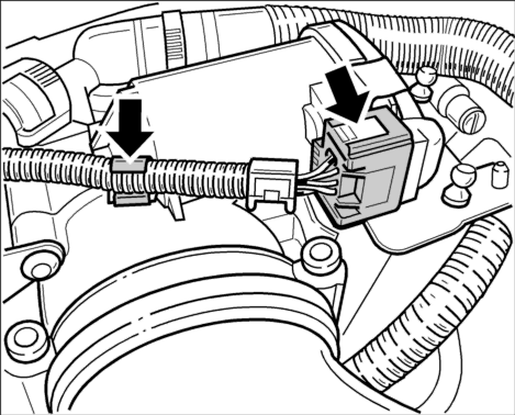 1. Отсоединить электрический разъем сервопривода дроссельной заслонки. Для этого сверху и снизу нажать на разъем и одновременно снять. Освободить кабель из плоского зажима.