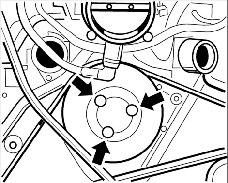 3. Ослабить 3 крепежных болта на ременном шкиве водяного насоса. Размер под ключ T 40.