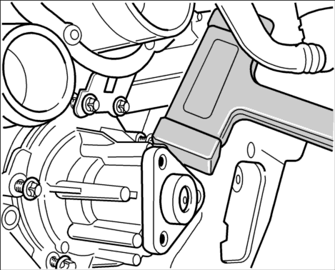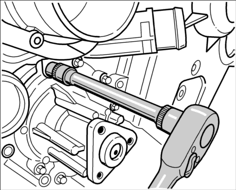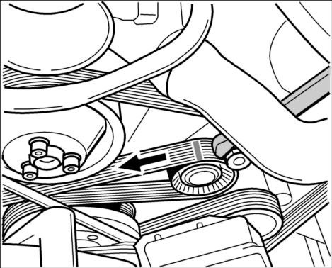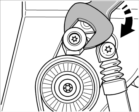 5. Натяжитель ремня повернуть по часовой стрелке вильчатым гаечным ключом (SW30) и одновременно снять приводной ремень с натяжного ролика. Осторожно освободить натяжитель ремня. Снять приводной ремень с водяного насоса.