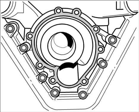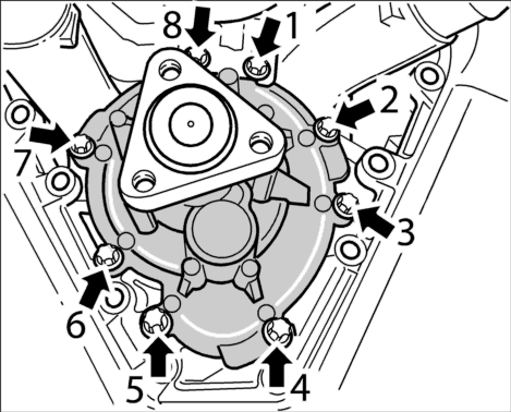 7. Выкрутить 8 крепежных болтов водяного насоса и снять насос. Если насос не снимается, слегка ударить по нему несколько раз пластмассовым молотком.
