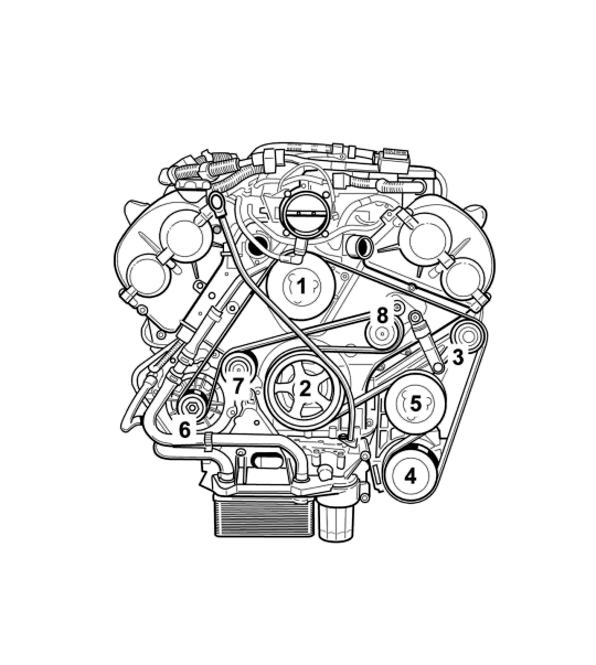4. Установить приводной ремень -как показано ниже- . Для этого закрутить натяжитель ремня по часовой стрелке и установить приводной ремень на все ролики. Затем осторожно ослабить натяжитель ремня.