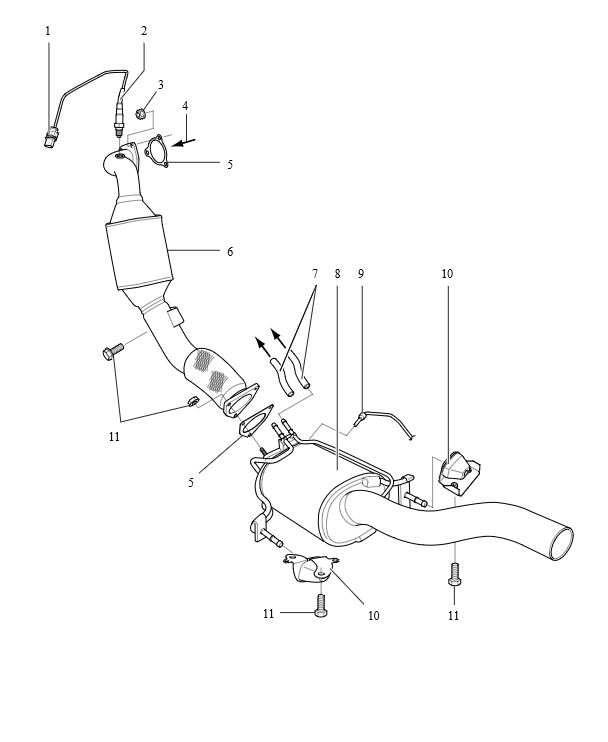 1. Разъедините систему выпуска ОГ на хомуте системы выпуска ОГ -стрелка- .