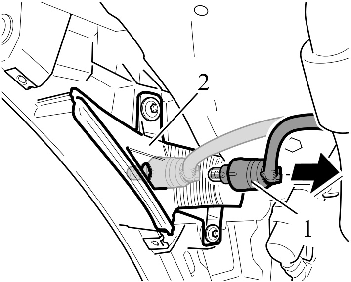 6.1. Шланг омывателя фар -2- установить в зажим -1- , -стрелка- до ощутимого щелчка.