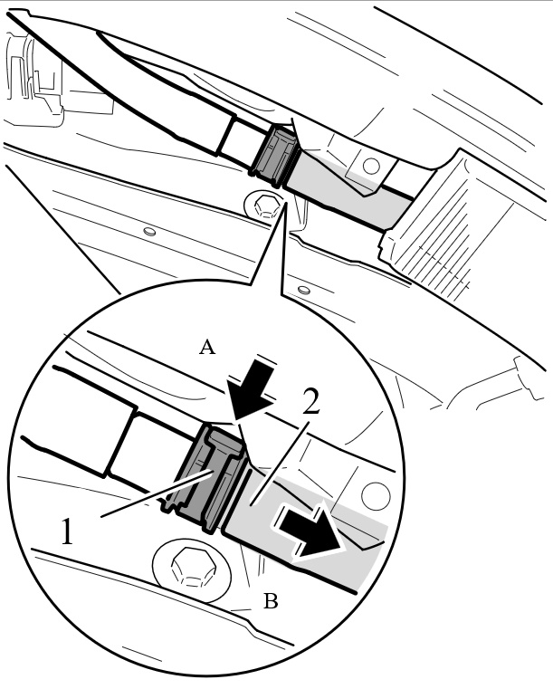 3. Разъемы -1 и 2- на правой стороне разблокировать -стрелки A- и отсоединить -стрелка B- .
