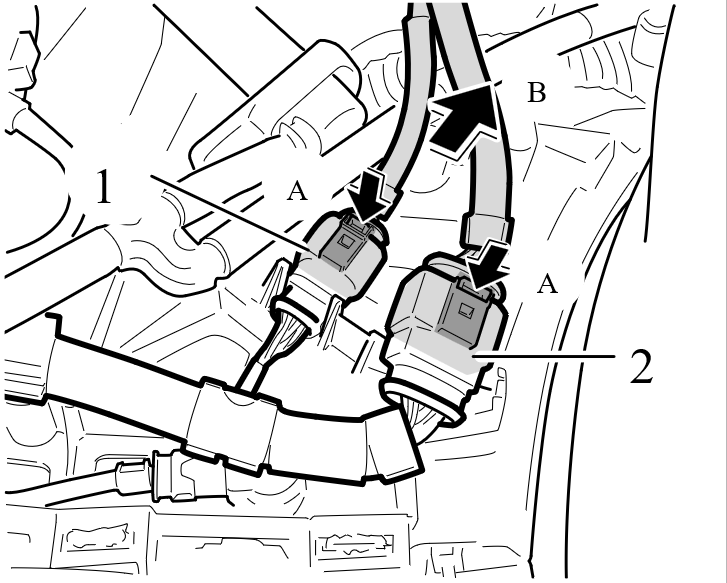 2.1. Муфту -1- разблокировать -стрелка A- и отсоединить водяной шланг -2- омывателя фар -стрелка B- .
