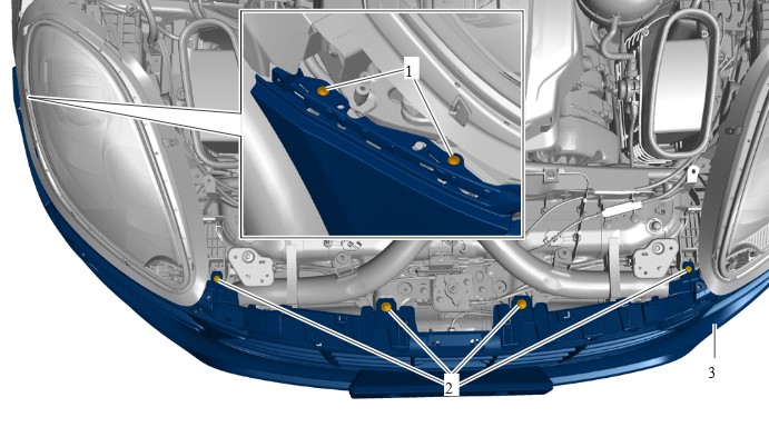 2. Затянуть винты крепления облицовки передней части кузова к крепежной планке с предписанным моментом затяжки. Момент затяжки 2 Nm