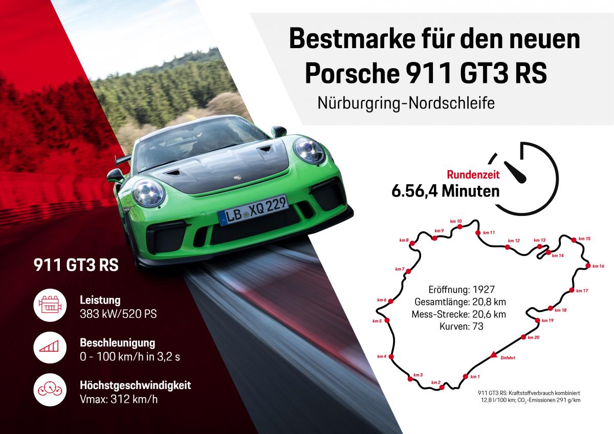 Штуттгарт. 16 апреля новый Porsche 911 GT3 RS поставил на Северной петле Нюрбургринга новый рекорд для спортивных автомобилей с допуском к эксплуатации на дорогах общего пользования: заводской пилот Porsche Кевин Эстре за рулем GT3 RS мощностью 520 л.с. прошел круг за 6 минут 56,4 секунды. Француз превзошел лучшее время прошлой модели почти на 24 секунды. Попеременно с Эстре GT3 RS управлял также пилот-испытатель Ларс Керн. После 918 Spyder и 911 GT2 RS новый GT3 RS стал уже третьим серийным спортивным автомобилем Porsche, который преодолел сложнейшую в мире трассу менее чем за семь минут, что было официально подтверждено после заезда. Замеры производились на обычной для рекордных заездов дистанции, составляющей 20,6 км.