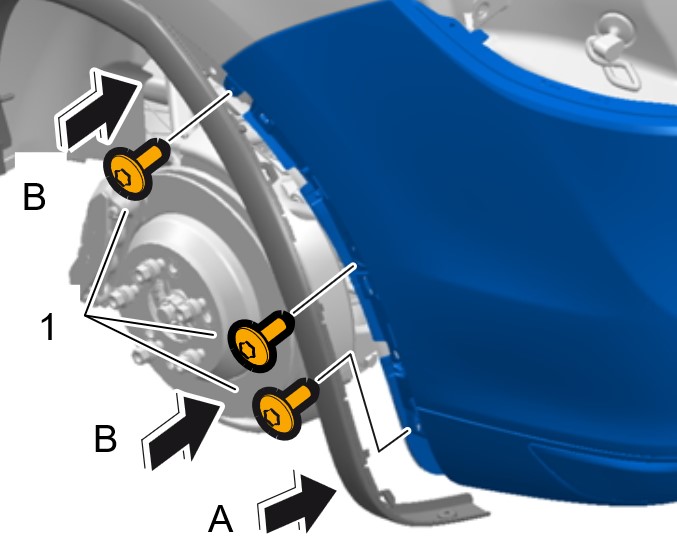 4. Потянуть облицовку колесной арки в сторону -A- и вывернуть крепежные винты -1- сбоку на облицовке задней части кузова -B- .
