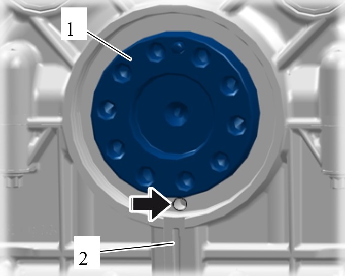 1. Чтобы при демонтаже уплотнительного кольца не был поврежден картер -2- , расположить пробойник в положении -стрелка- под коленчатым валом -1- .