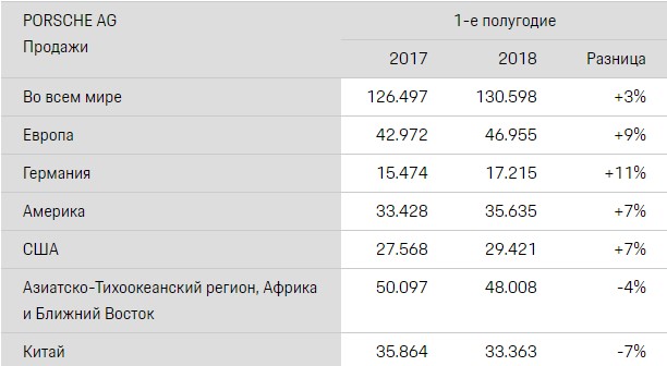 На родном для Porsche немецком рынке в первом полугодии 2018 года отмечается рост на 11 процентов; в Европе в целом – на 9 процентов. Самым крупным рынком сбыта для Porsche остается Китай, здесь клиентам было передано 33 363 автомобиля, за ним следует рынок США (29 421 автомобиль). Уменьшение объемов продаж в Китае на 7 процентов объясняется, прежде всего, снижением импортных пошлин с 1 июля 2018 года. После того, как об этой мере было объявлено, значительное количество клиентов воздержалось от покупки. «Политическая и экономическая ситуация на наших основных рынках, особенно в Китае и США, в настоящее время ставит существенные задачи. В Европе мы подготавливаем модельный ряд к будущим стандартам отработавших газов. Тем не менее, глядя на нашу позитивную динамику в первые шесть месяцев, мы уверены, что и в этом году достигнем высокого уровня прошлого года», – говорит Детлев фон Платен.