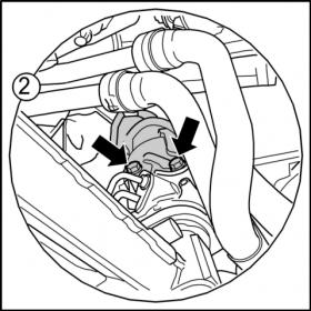 12. Для улучшения демонтажа рулевого механизма отвернуть крепежную гайку на шлангах ОЖ. Затем отсоединить шланги ОЖ -см. рисунок- из креплений и положить их вверх (здесь рулевой механизм представлен прозрачным).