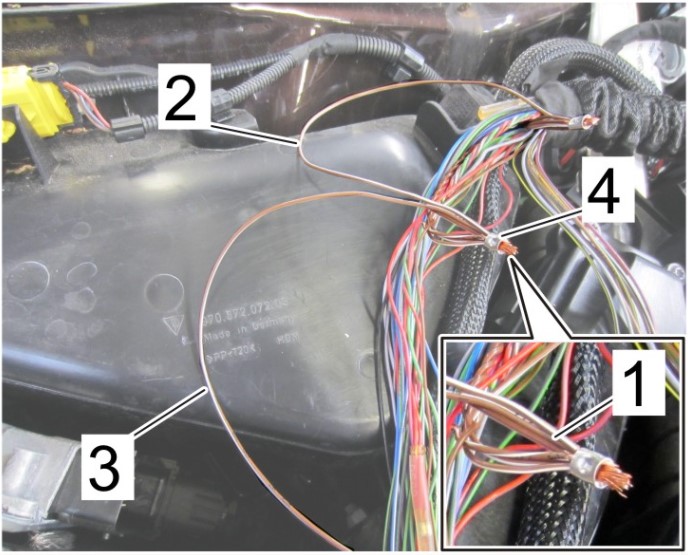 Провода с удаленной изоляцией -1- сдвинуть вместе с новым проводом из 1-го отростка ( -2- ) и дополнительно с длинным проводом (для контакта 42) из ремонтного комплекта -3- в зажим BDM -4- .