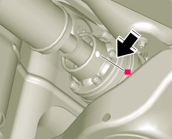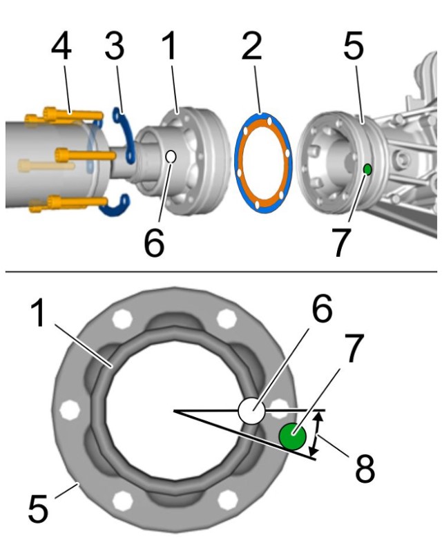 Регулировка точки совпадения: белая точка фланца карданного вала может быть смещена по отношению к зеленой точке фланца главной передачи задней оси не более чем на 30°.