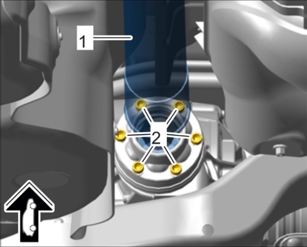 2.2 Установить карданный вал в направлении -направление стрелки 1- на зубчатое зацепление коробки передач.