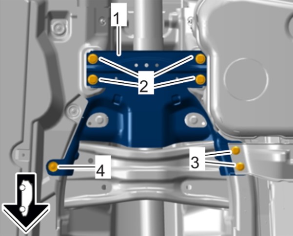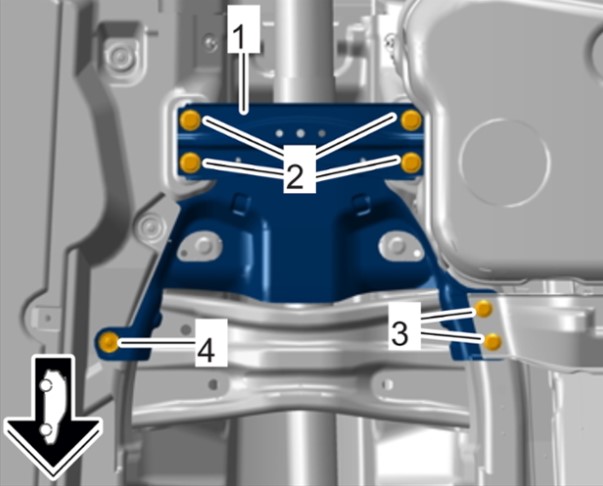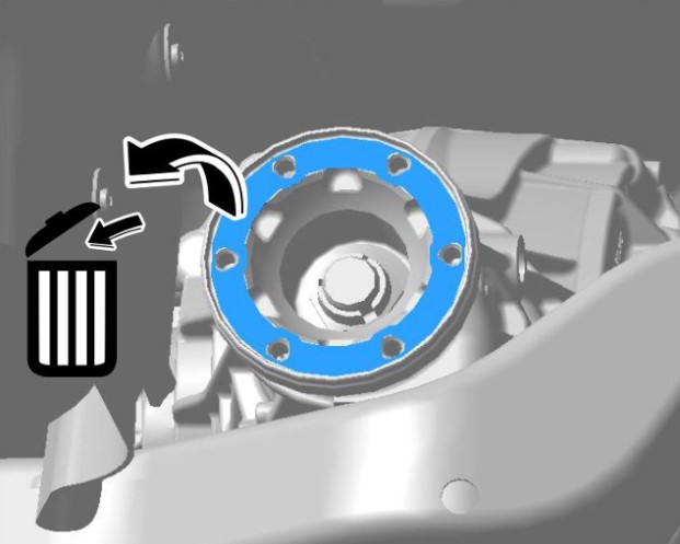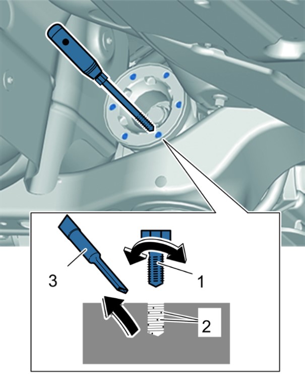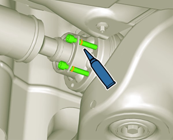 5.1 Наживить, соответственно, два новых крепежных винта вместе с новой подкладной пластиной на главной передаче задней оси, как показано на рисунке.