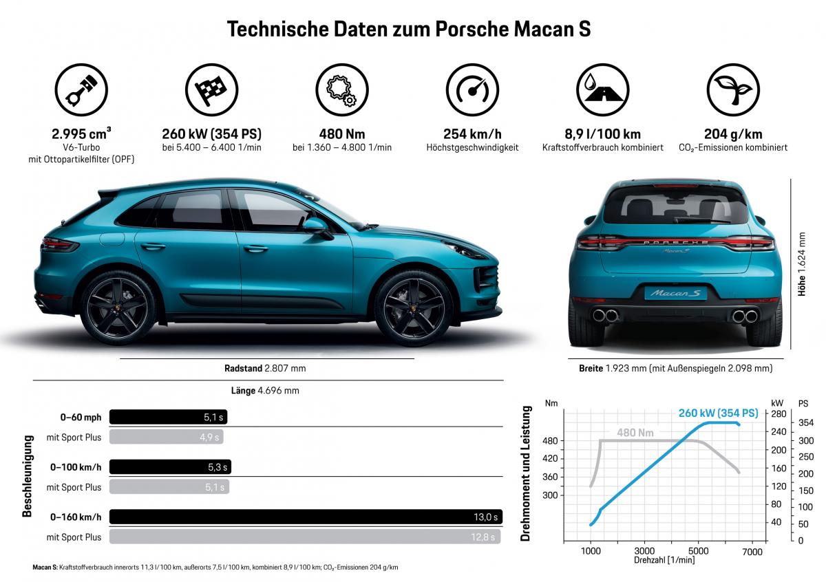 Macan S: расход топлива в смешанном цикле 8,9 л/100 км; выбросы CO2 в смешанном цикле 204 г/км