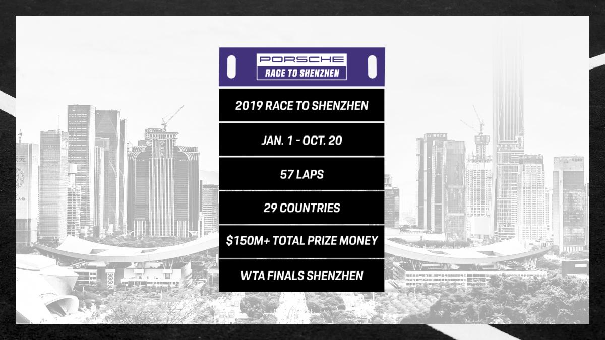 Porsche Race to Shenzhen – это официальный квалификационный рейтинг, определяющий участниц финала WTA. Право выступить на турнире получат восемь лучших теннисисток и восемь лучших пар сезона. Место в годовом рейтинге Porsche Race to Shenzhen очень важно. Учитываются лучшие результаты каждой теннисистки на 57 турнирах (53 турнира WTA и четыре «Большого шлема») до финала WTA. Каждый турнир символически представлен в виде круга с отдельным пит-стопом. Теннисистка, набравшая наибольшее количество баллов, в качестве награды получает автомобиль Porsche. В прошлые два года спорткар доставался румынке Симоне Халеп. Престижный турнир впервые после пяти лет проведения в Сингапуре пройдет в двенадцатимиллионном Шеньчжене, который связывает Гонконг с материковым Китаем.