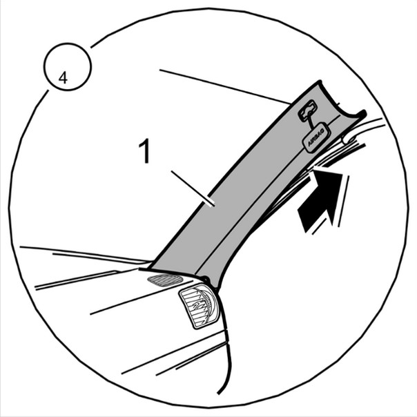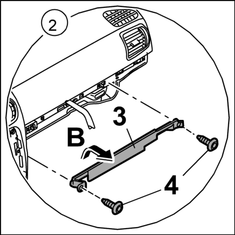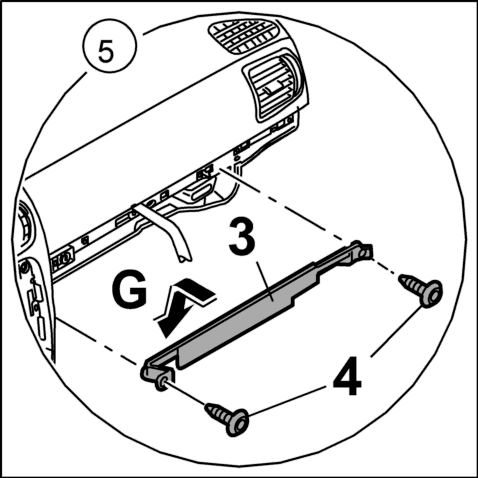 12. Только в комплектации для США: вставить усилитель накладки со стороны переднего пассажира -3- , -стрелка G- .