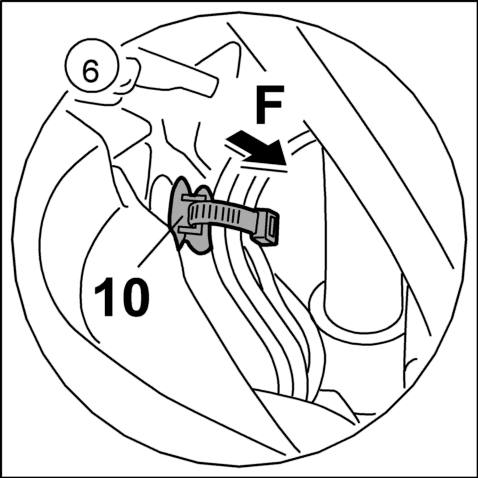 10. Вставить разъем приборов -1- полностью -стрелка F- .