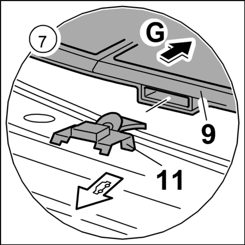 21. Осторожно выдвинуть переднюю панель -9- назад -стрелка G- из фиксаторов -11- .