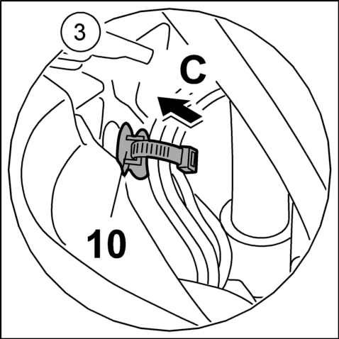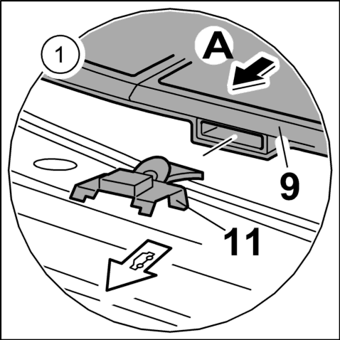 1. Для этого осторожно ввести переднюю панель -9- , -стрелка A- , пока не появится возможность -10- зафиксировать зажимы -стрелка C- .