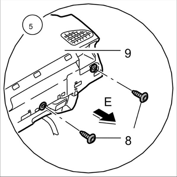 19. Переднюю панель -9- осторожно потянуть назад -стрелка E- , пока не будет доступно зажимное соединение в районе стойки A.