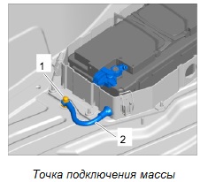 3. Опасность короткого замыкания! Отвернуть плоский провод массы -2- на точке подключения массы -1- под сиденьем водителя перед отсеком для АКБ.