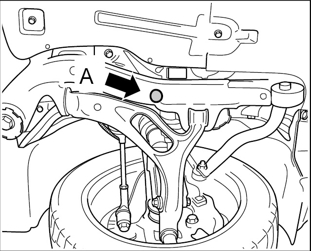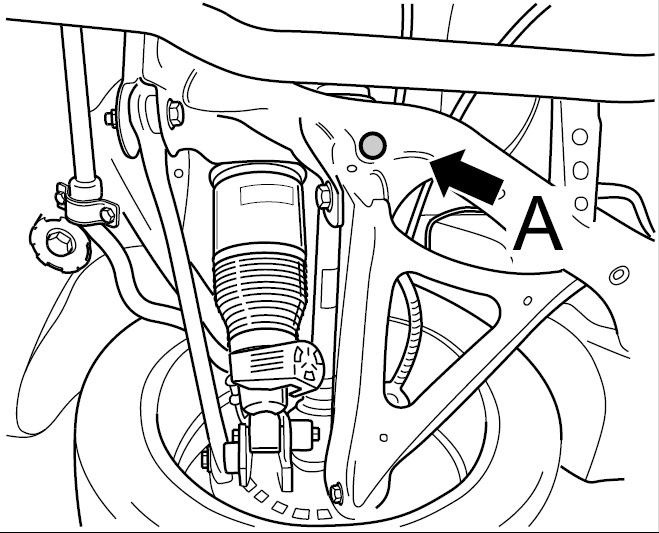 Измеряется расстояние (по центру колеса) между площадкой (пятно контакта шины на измерительной платформе) и точкой измерения -A- на балке подвески.