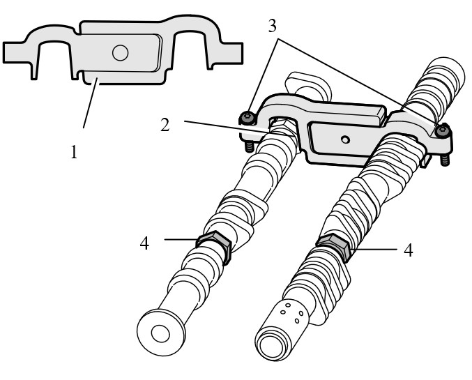 1 - Фиксирующий инструмент Фиксирующий инструмент . Два одинаковых фиксирующих инструмента необходимы для четырех распредвалов.