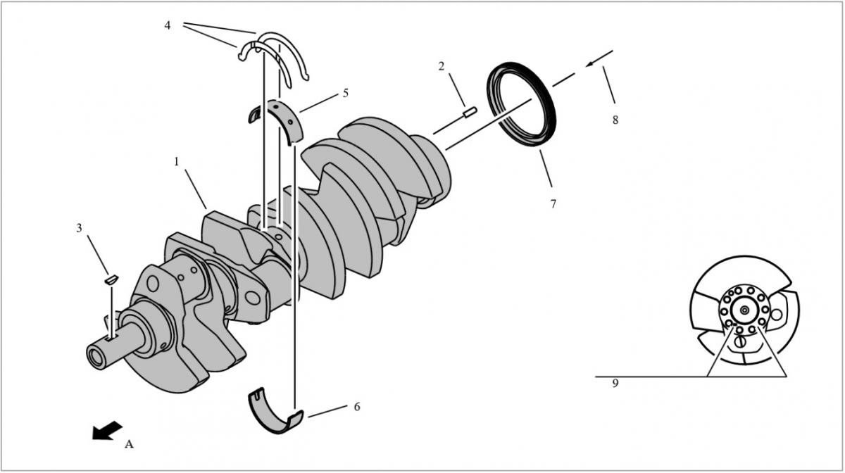 Классификация подшипников коленчатого вала (тройственная) G желтый; B синий, R красный; (пример: GGGGG-BBBB; 5 коренных подшипников с желтой маркировкой, 4 двойных (8) шатунных подшипника с синей маркировкой) => отсчет см. A