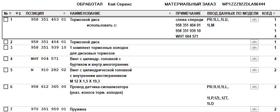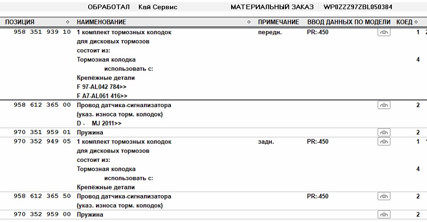 Требуется замена тормозных дисков и колодок. WP1ZZZ92ZELA56206 Подскажите пожалуйста номера агрегатов, в том числе датчиков износа, болтов и пружин.